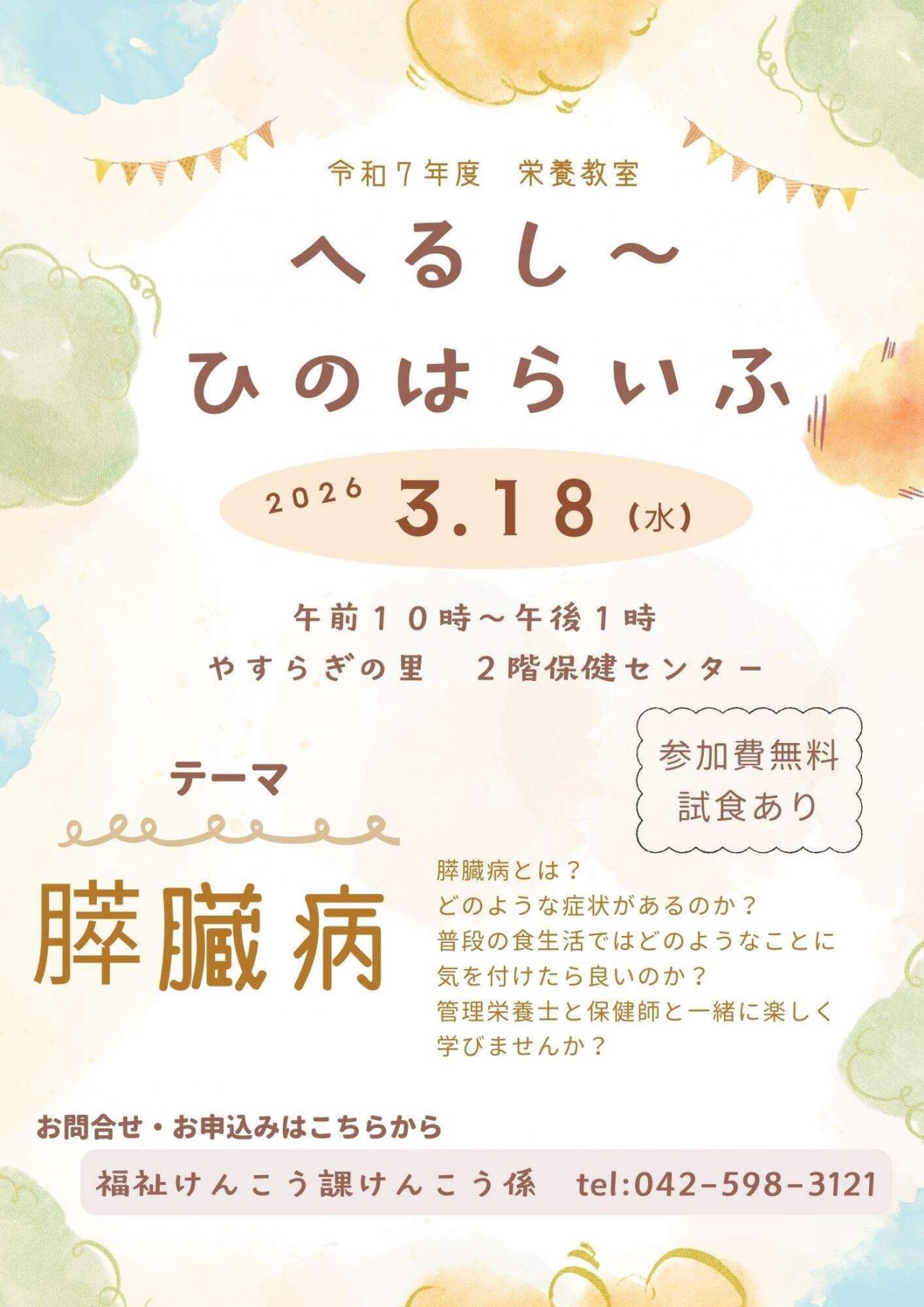 令和7年度 第6回栄養教室「ヘルシ~ひのはらいふ」が開催されます。今回のテーマは【膵臓病】です。管理栄養士と保健師と一緒に楽しく学びませんか?ぜひご参加ください!開催日:2026年3月18日(水)